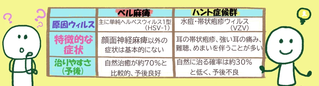ハント症候群は、顔面神経麻痺の中でも特に重症化しやすく、後遺症が残りやすい厄介なタイプです。顔面神経麻痺で最も多い「ベル麻痺」としばしば混同されますが、その原因と症状には決定的な違いがあります。